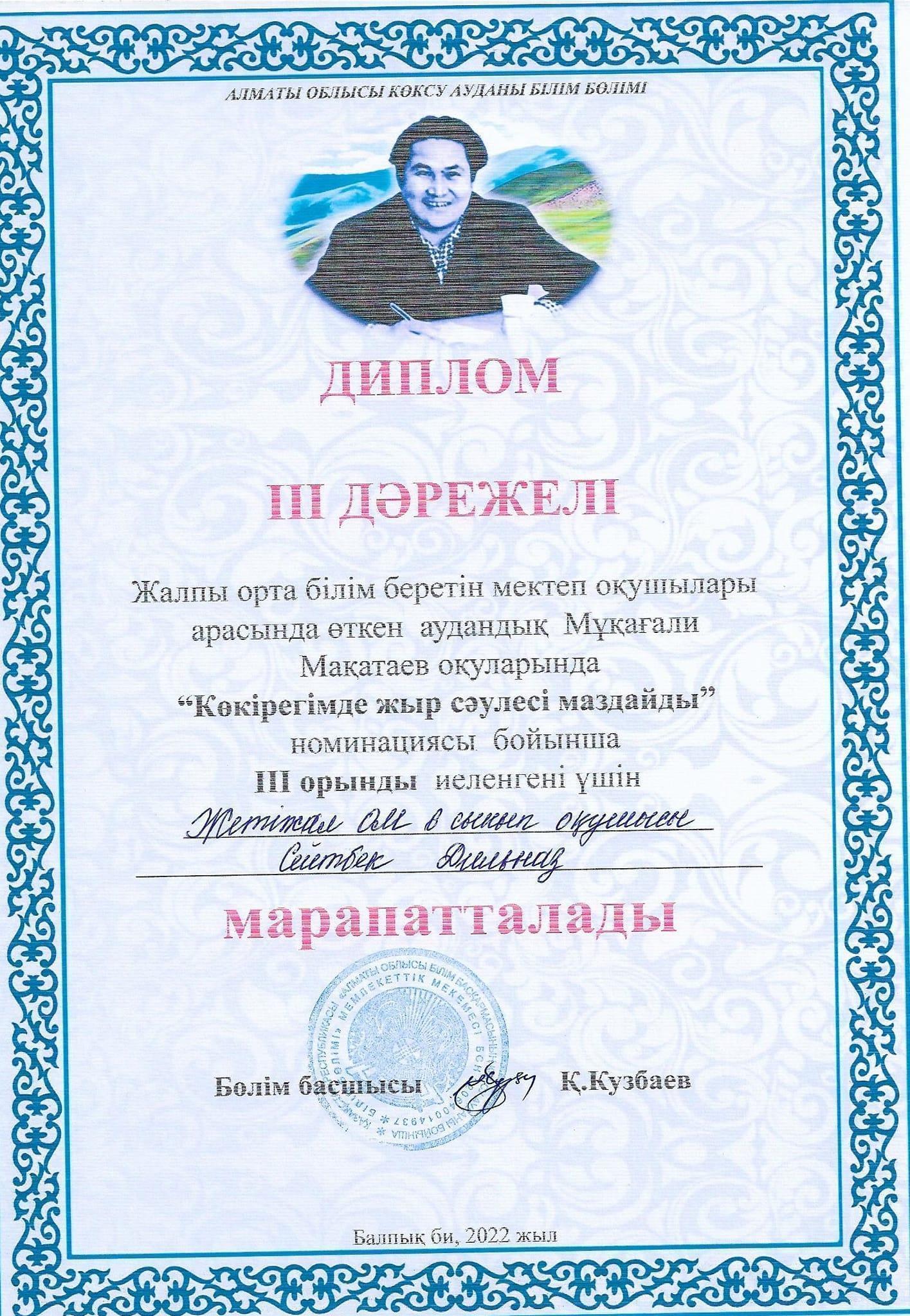 Жалпы орта білім беретін мектеп оқушылары арасында өткен Мұқағали Мақатаев оқуларында "Жыр эстафетасы" номинациясы бойынша ІІ орын, "Көкірегімде жыр сәулесі маздайды" номинациясы бойынша ІІІ орынды иеленгені үшін Жетіжал орта мектебінің 6 - сынып оқушысы Сейтбек Дилназ ІІ және ІІІ дәрежелі дипломдармен марапатталды.Жетекшісі:Сарсенбекова А.Б. Шын жүректен құттықтаймыз!!!