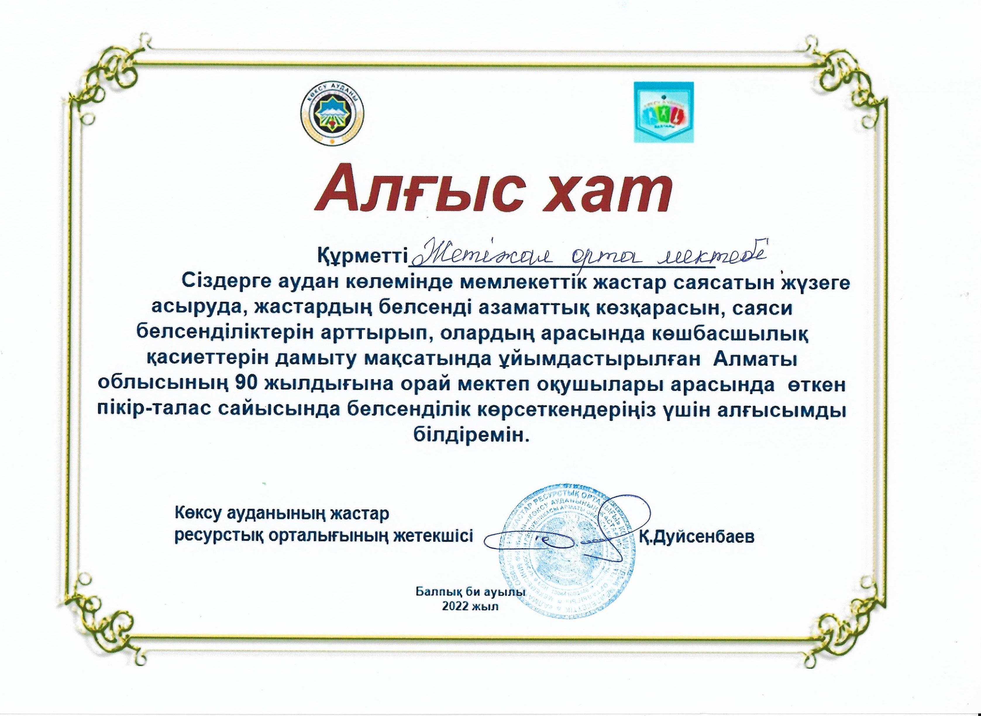 Аудандық Жастар ресурстық орталығы ұйымдастырған Алматы облысының 90 жылдығына орай мектеп оқушылары арасында өткен "Ұшқыр ой алаңы" атты пікір-сайыста 22 команда қатысып, мектебіміздің "НЛ" командасы алғыс хатпен марапатталды. Команда мүшелері Абдигаппарова Камила, Серікқызы Күнай