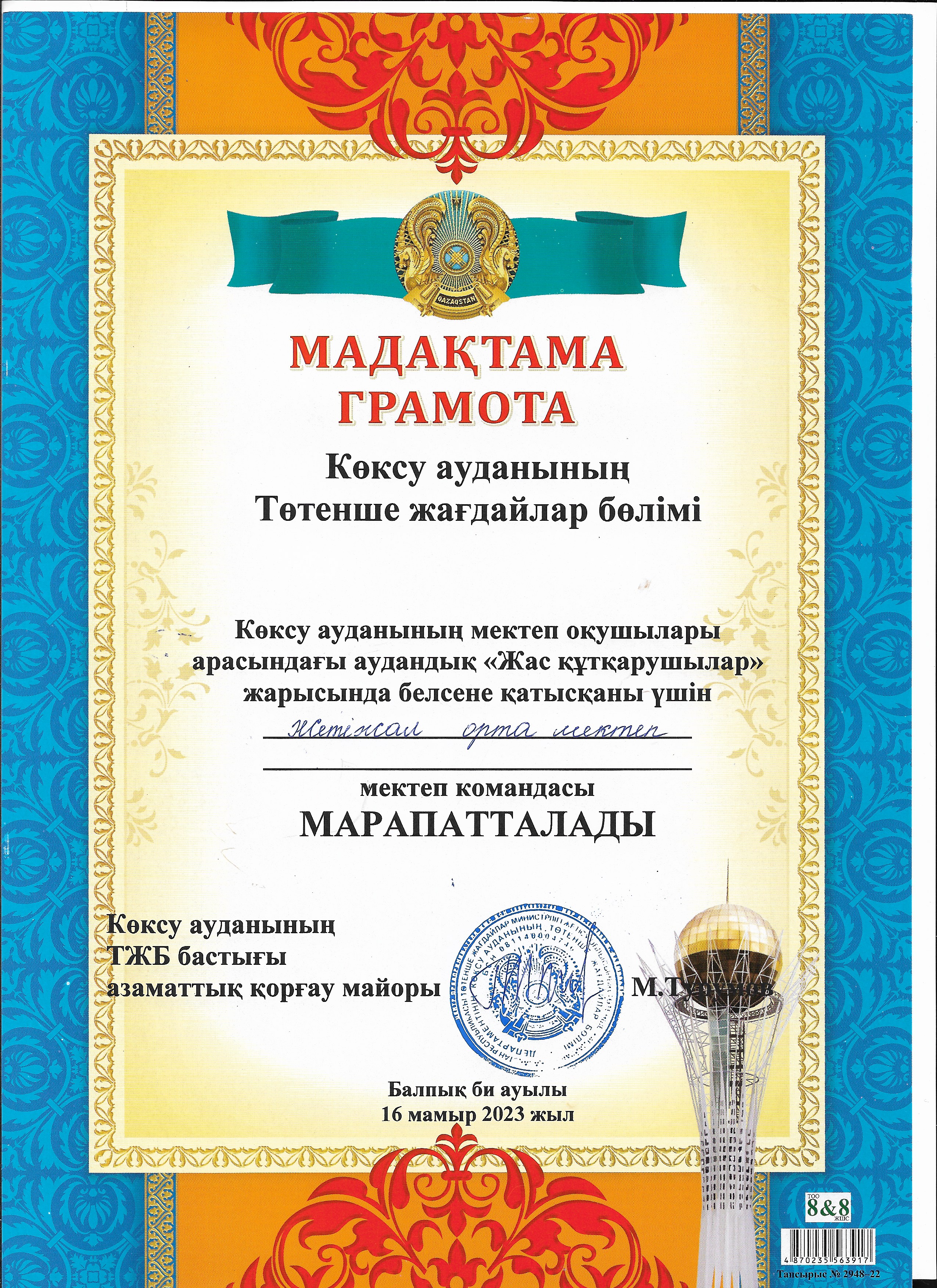 Аудандық әскери - спорттық "ЖАС ҰЛАН - 2023" байқауына Жетіжал орта мектебінің командасы қатысып,  "Азаматтық қорғаныс" номинациясы бойынша ІІІ орынға ие болып, "Саптық жаттығуларды орындау" номинациясы бойынша  ІІ орынды  жеңіп алды. Шын жүректен құттықтаймыз!!!