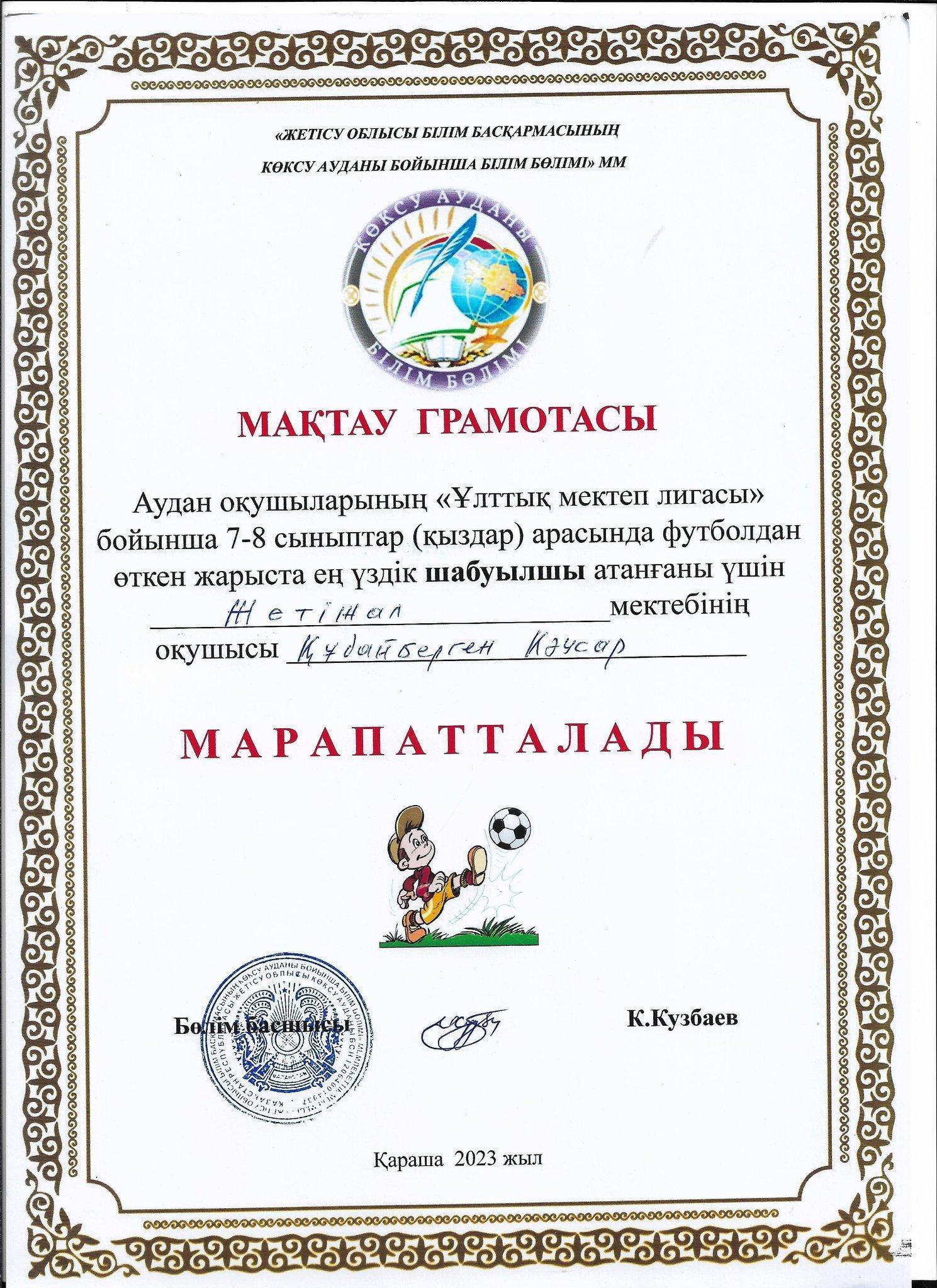 Аудан оқушыларының ""Ұлттық мектеп лигасы" бойынша 7-8 сыныптар (ҚЫЗДАР) арасында футболдан өткен жарыста Жетіжал орта мектебінің командасы І орынға ие болды. Шын жүректен құтықтаймыз!!! Пән мұғалімі, жаттықтырушы: Тлеуов И.К. » Көксу ауданы Жетіжал орта мектебі