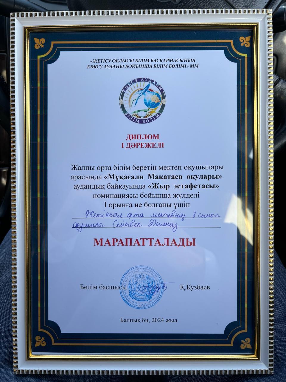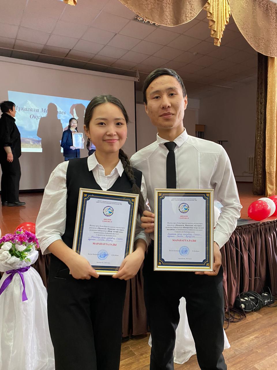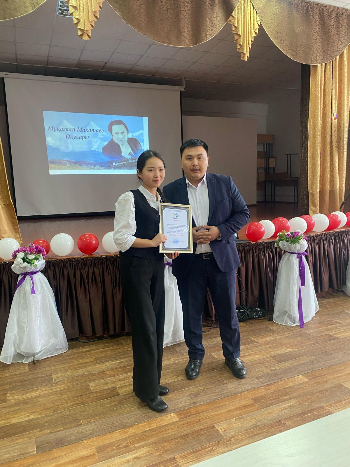 Жалпы орта білім беретін мектеп оқушылары арасында "Мұқағали Мақатаев оқулары" аудандық байқауында "Жыр эстафетасы" номинациясы бойынша мектебіміздің 8- сынып оқушысы Сейтбек Дильназ жүлделі І орынға ие болды, "Айтып өткен ақында арман бар ма?" номинациясы бойынша 9-сынып оқушы Дуйсен Бекнұр жүлделі ІІ орынға ие болды. Шын жүректен құттықтаймыз!!!Жетекшілері: Сарсенбекова А.Б., Мусахметова Г.А.