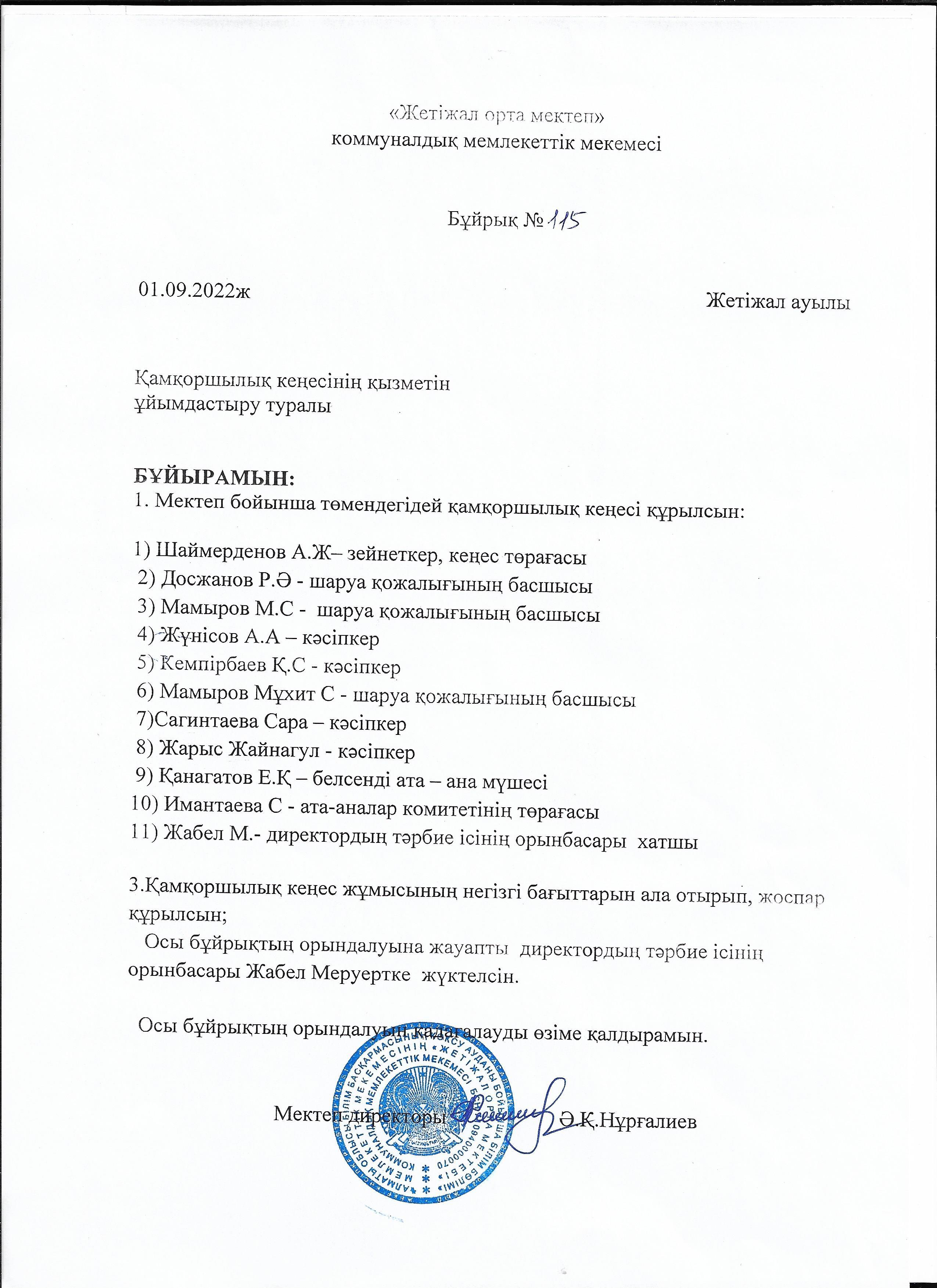 Қамқоршылық кеңесі №115бұйрық » Көксу ауданы Жетіжал орта мектебі