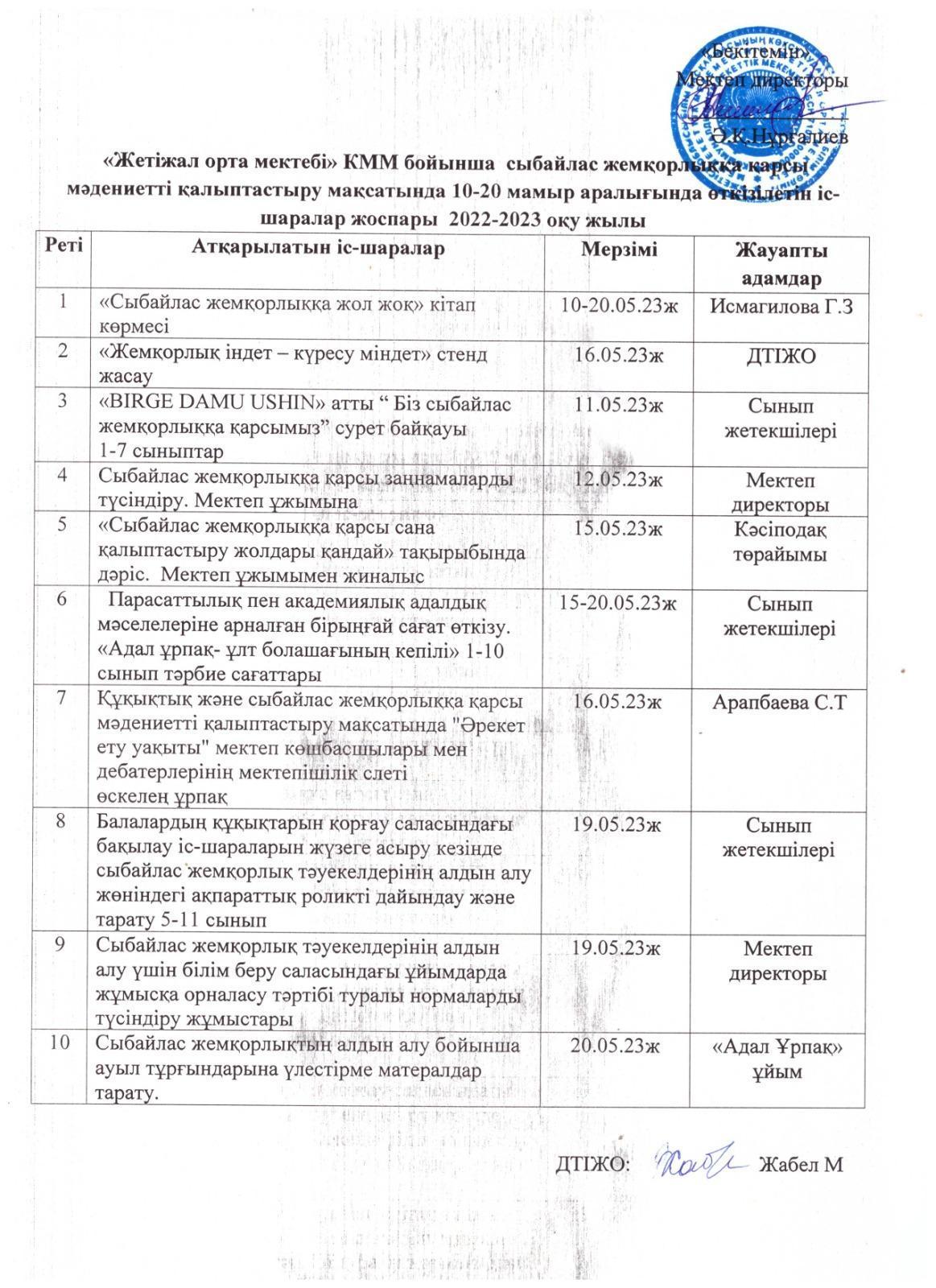 08 май 2023 0 1 2 3 4 5 Сыбайлас жемқорлыққа қарсы мәдениетті қалыптастыру мақсатында өткізілетін іс-шара жоспары