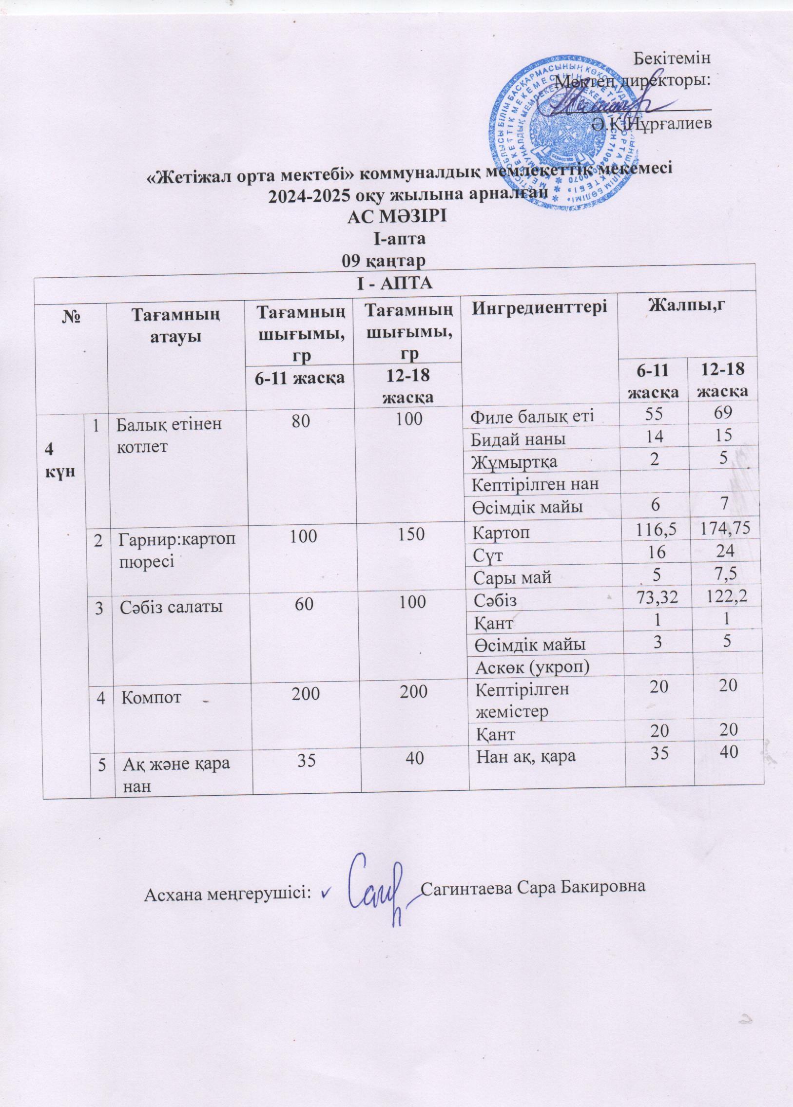 Ас мәзірі 09.01.2025ж » Көксу ауданы Жетіжал орта мектебі