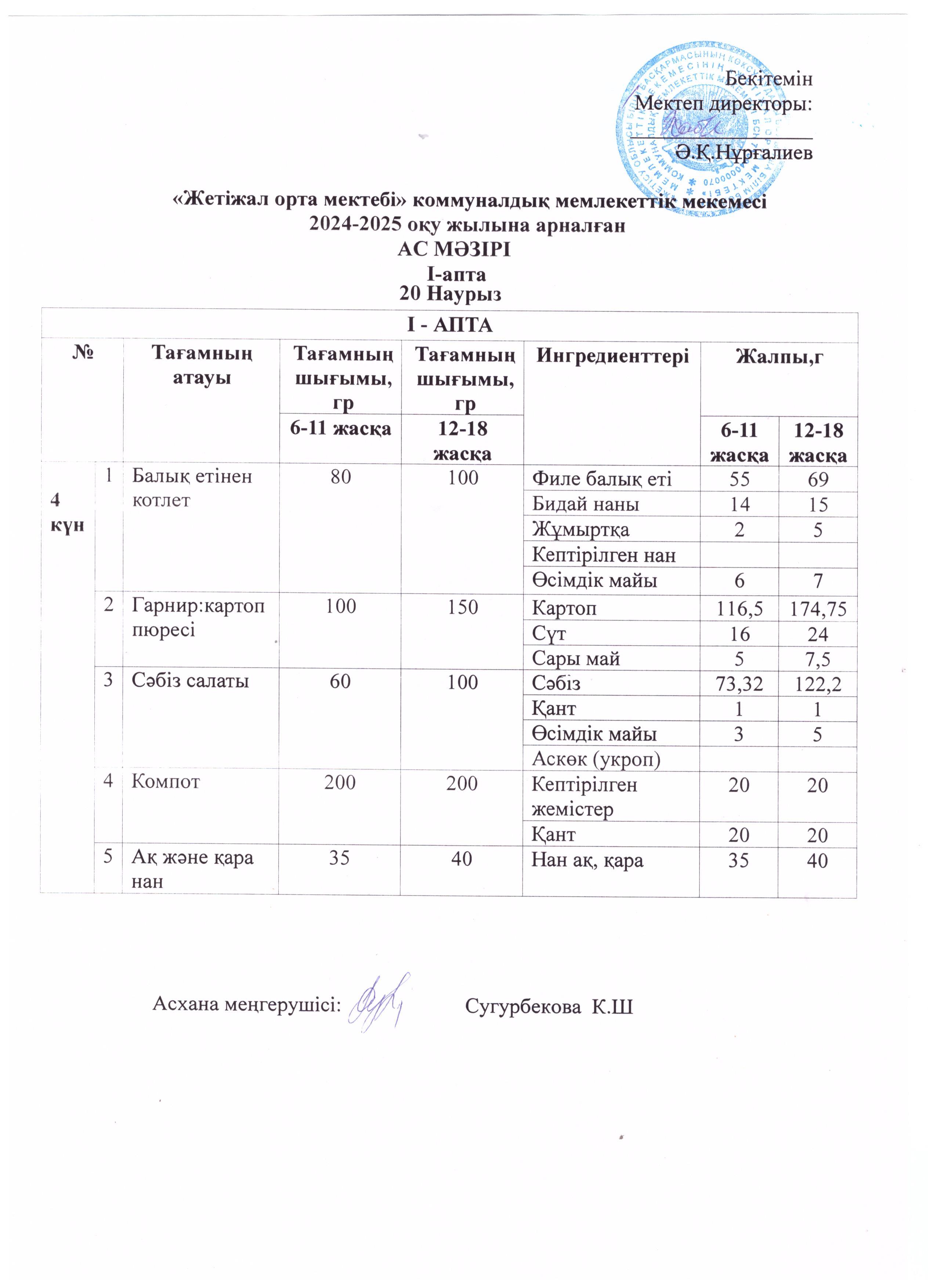 Ас мәзірі 20.03.2025ж » Көксу ауданы Жетіжал орта мектебі
