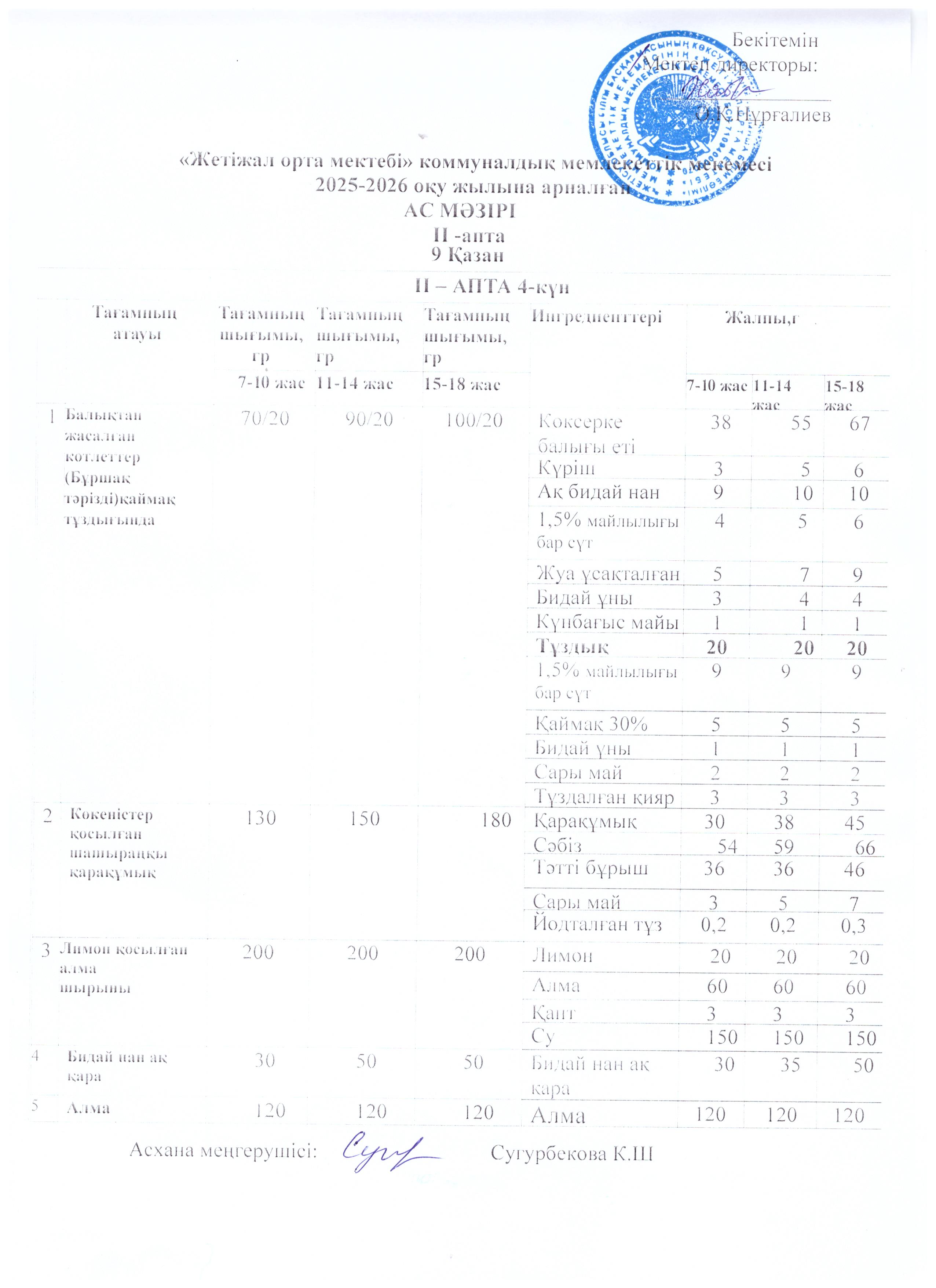 Ас мәзірі 09.10.2025ж » Көксу ауданы Жетіжал орта мектебі
