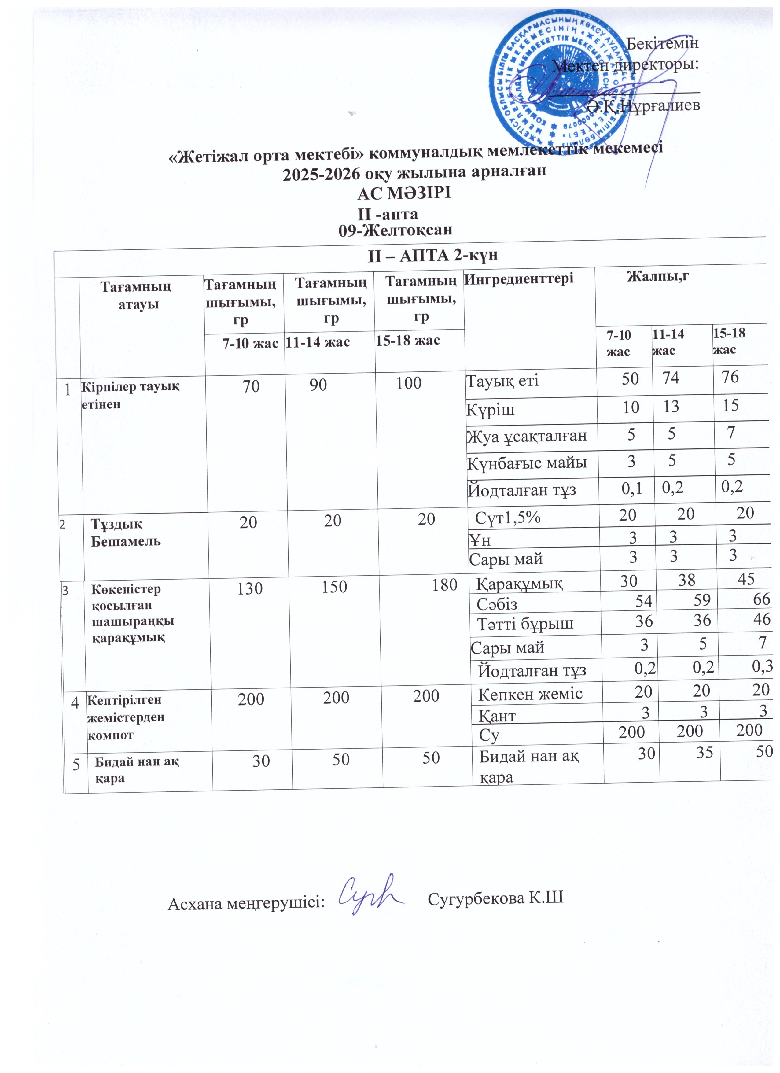 Ас мәзірі 09.12.2025ж » Көксу ауданы Жетіжал орта мектебі