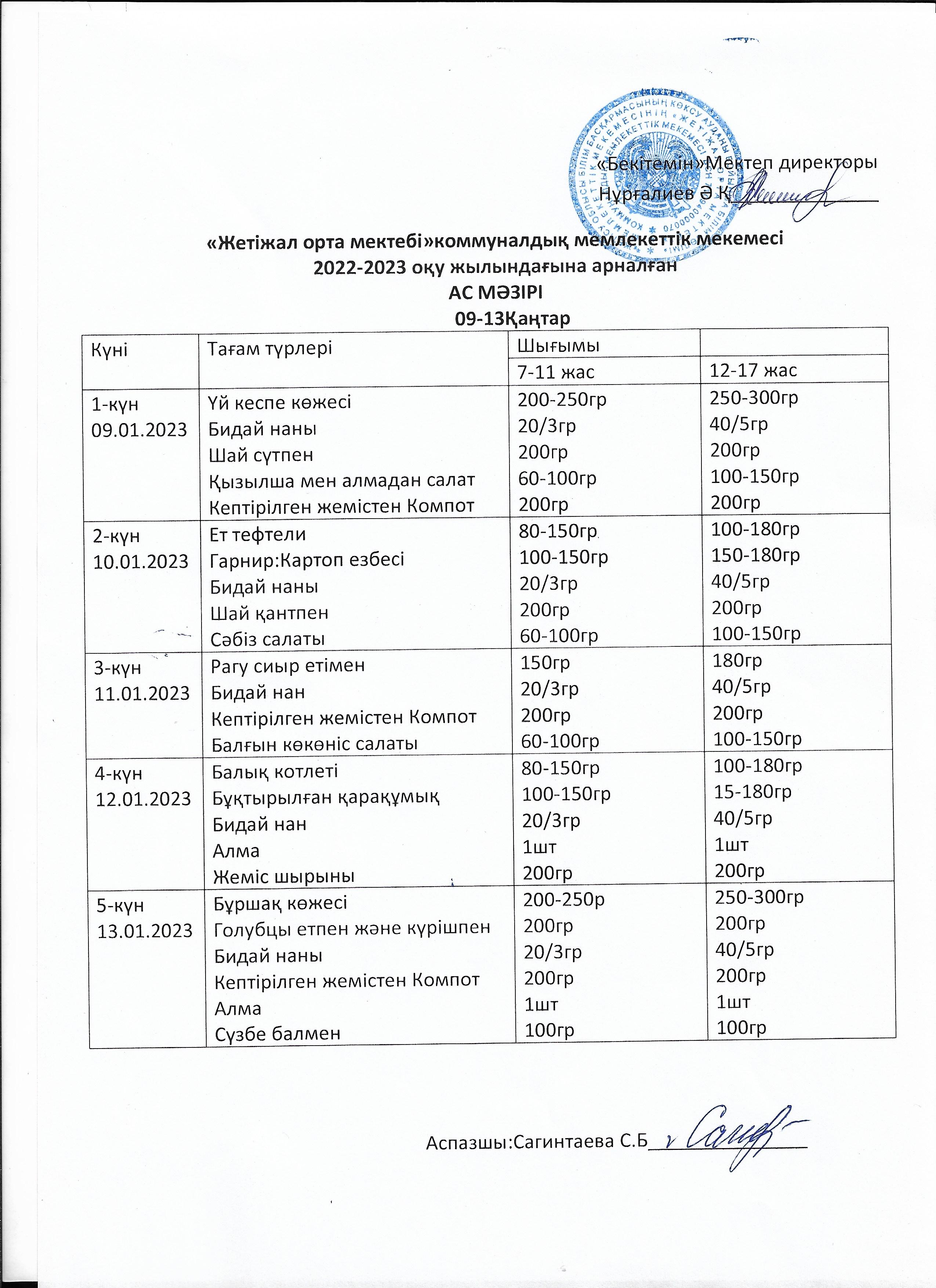 Ас мәзірі 9-13 қаңтар аралығы » Көксу ауданы Жетіжал орта мектебі