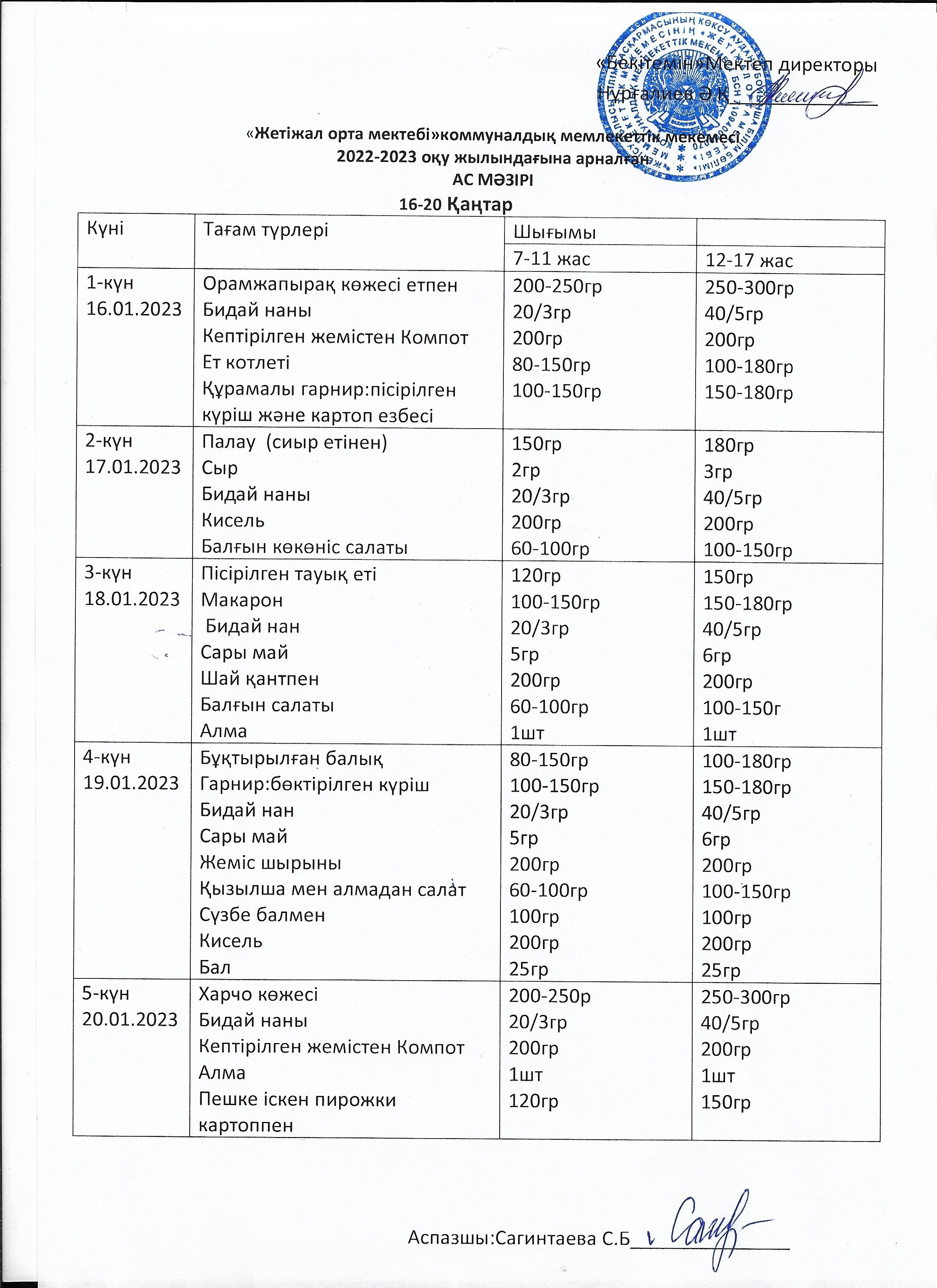 Ас мәзірі 16-20 қаңтар аралығы » Көксу ауданы Жетіжал орта мектебі