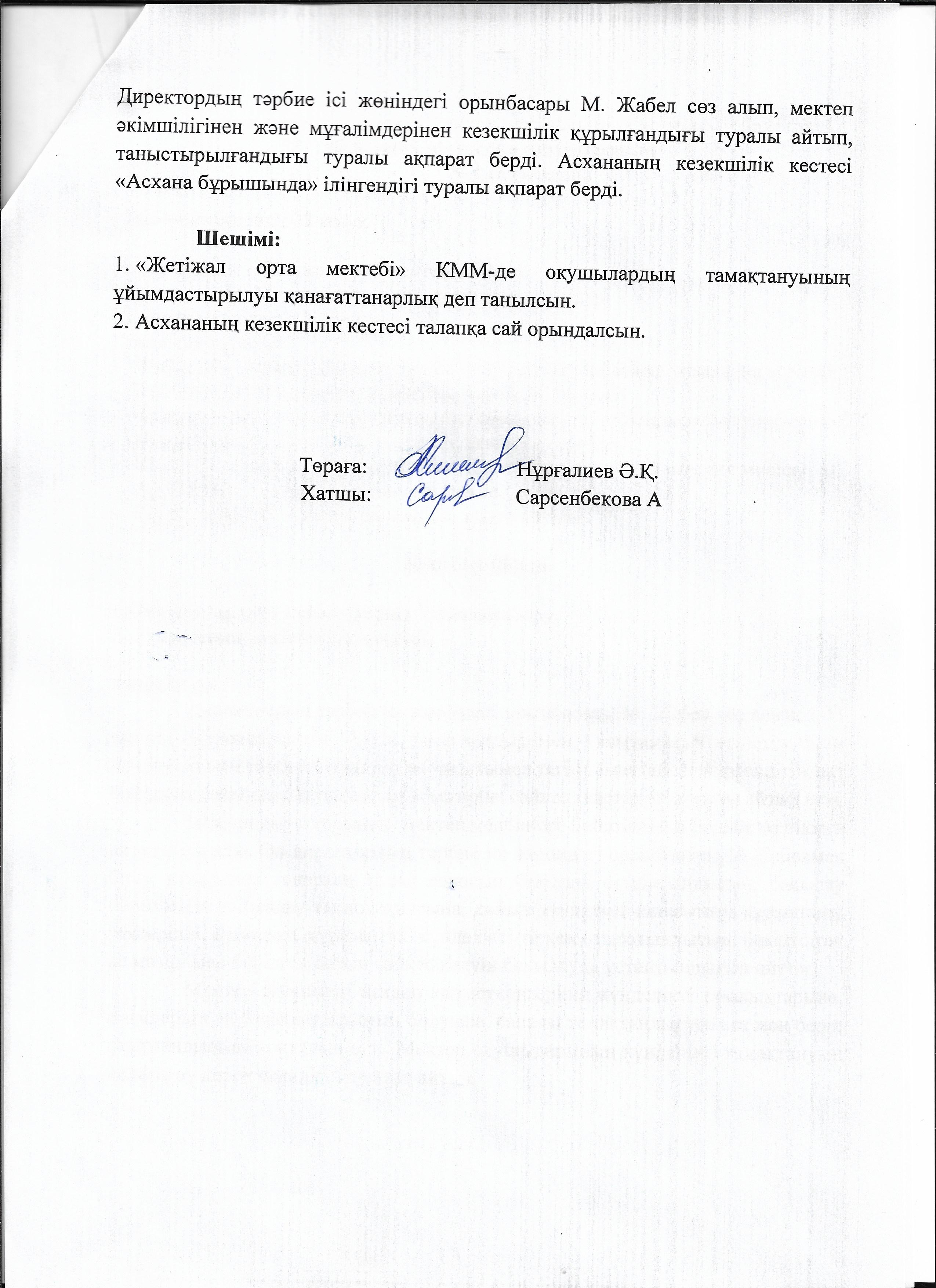 Мектеп асханасының жұмысын бақылау бойынша комиссия отырысының хаттамасы » Көксу ауданы Жетіжал орта мектебі