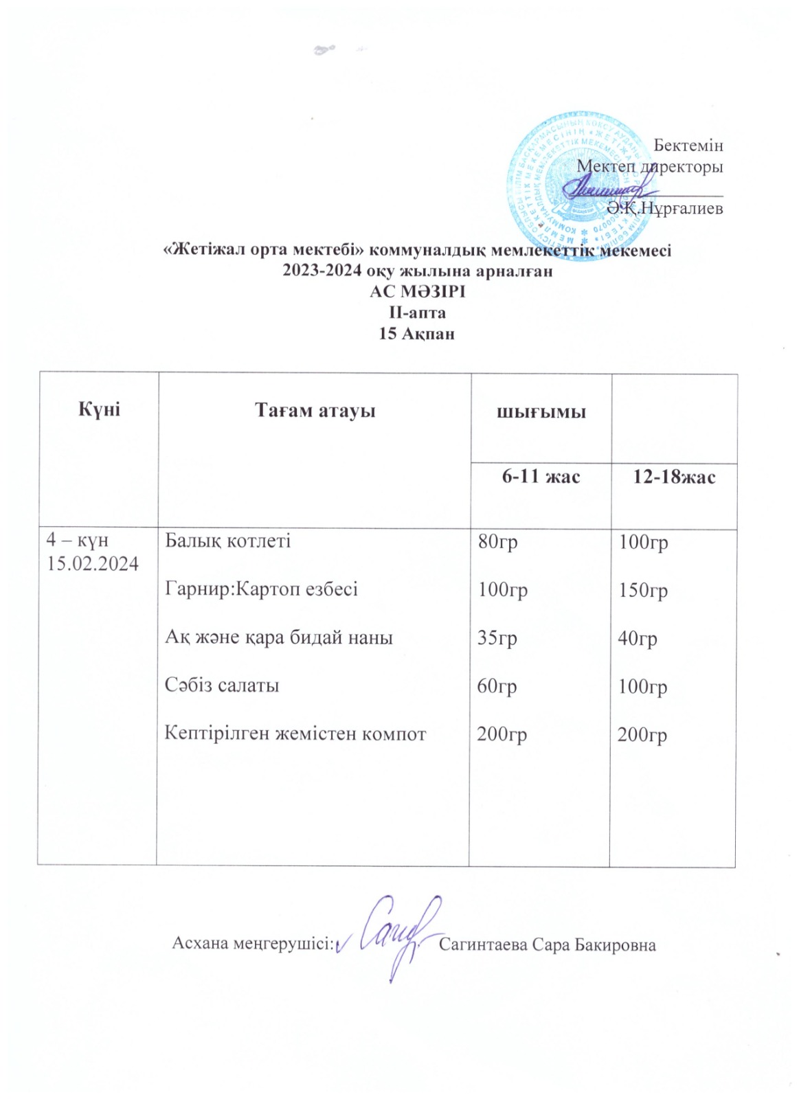 Ас мәзірі 15.02.2024ж » Көксу ауданы Жетіжал орта мектебі