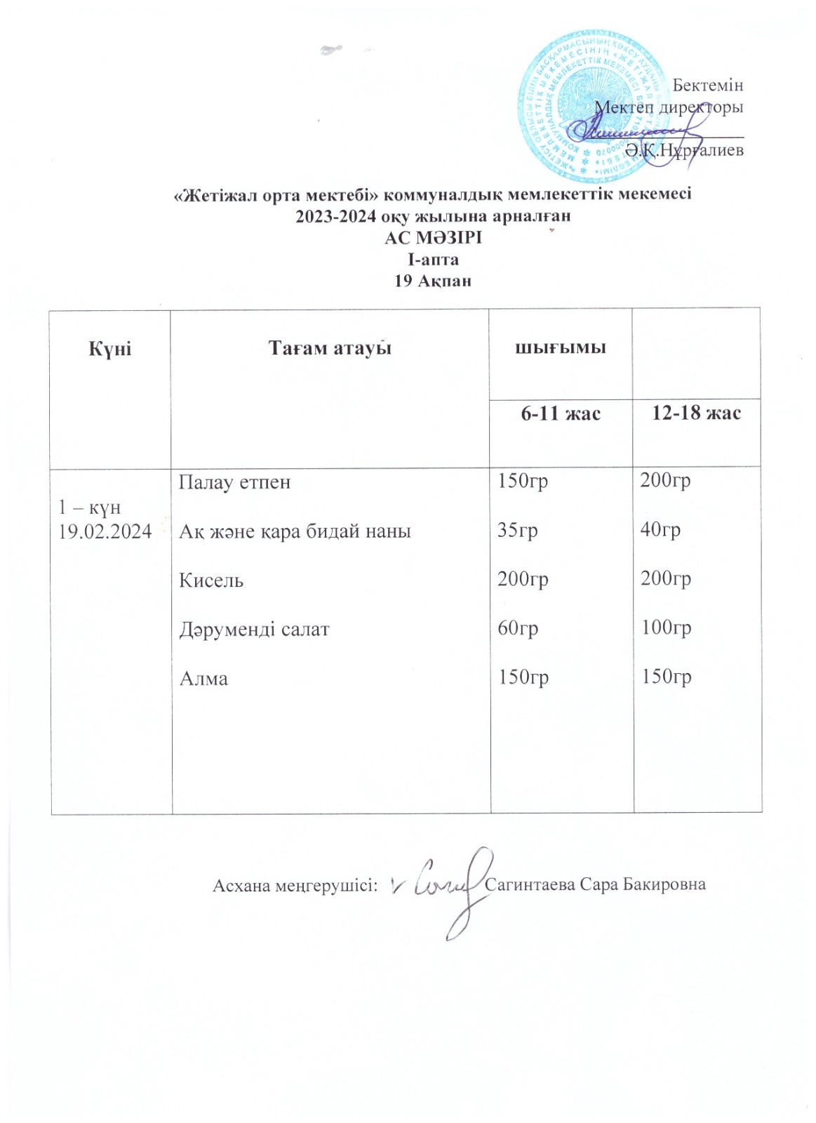 Ас мәзірі - 19.02.2024ж » Көксу ауданы Жетіжал орта мектебі