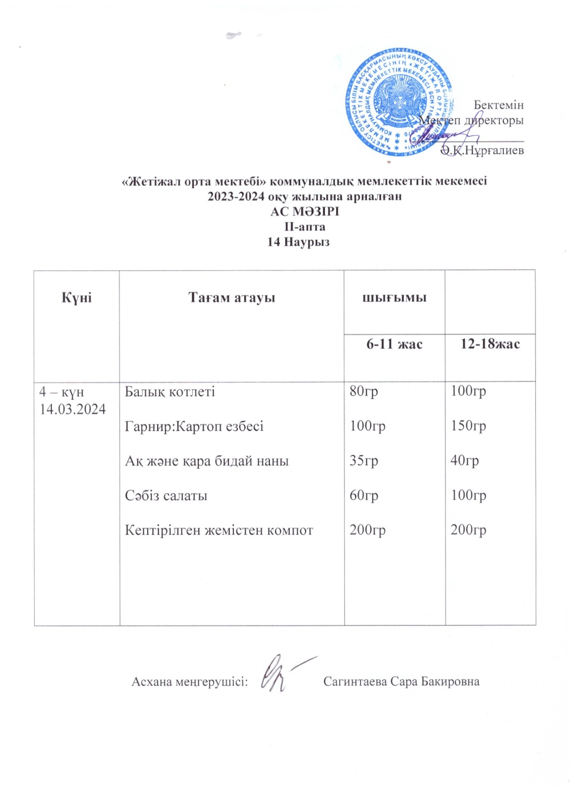 Ас мәзірі 14.03.2024ж » Көксу ауданы Жетіжал орта мектебі
