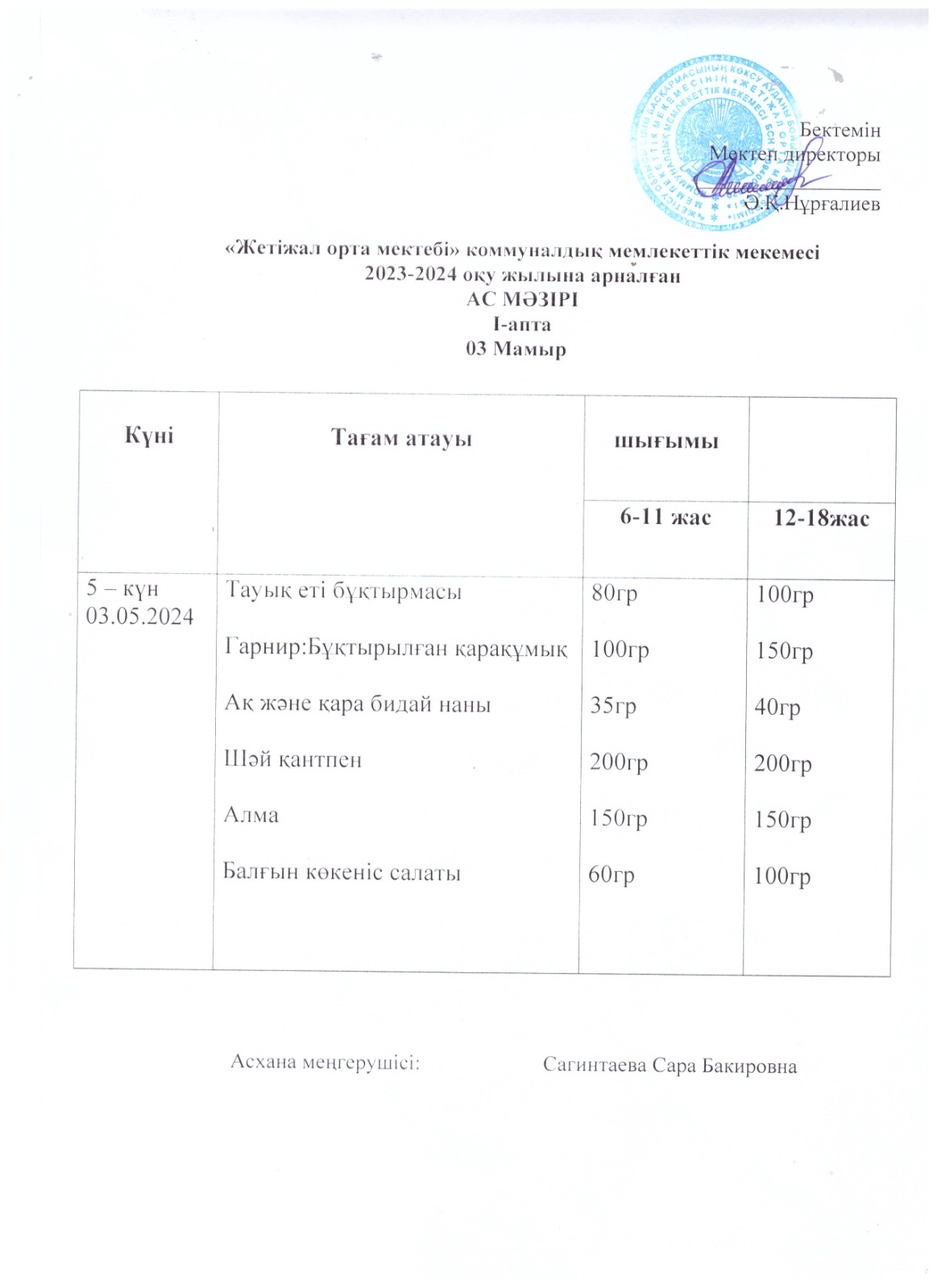 Ас мәзірі 03.05.2024ж » Көксу ауданы Жетіжал орта мектебі