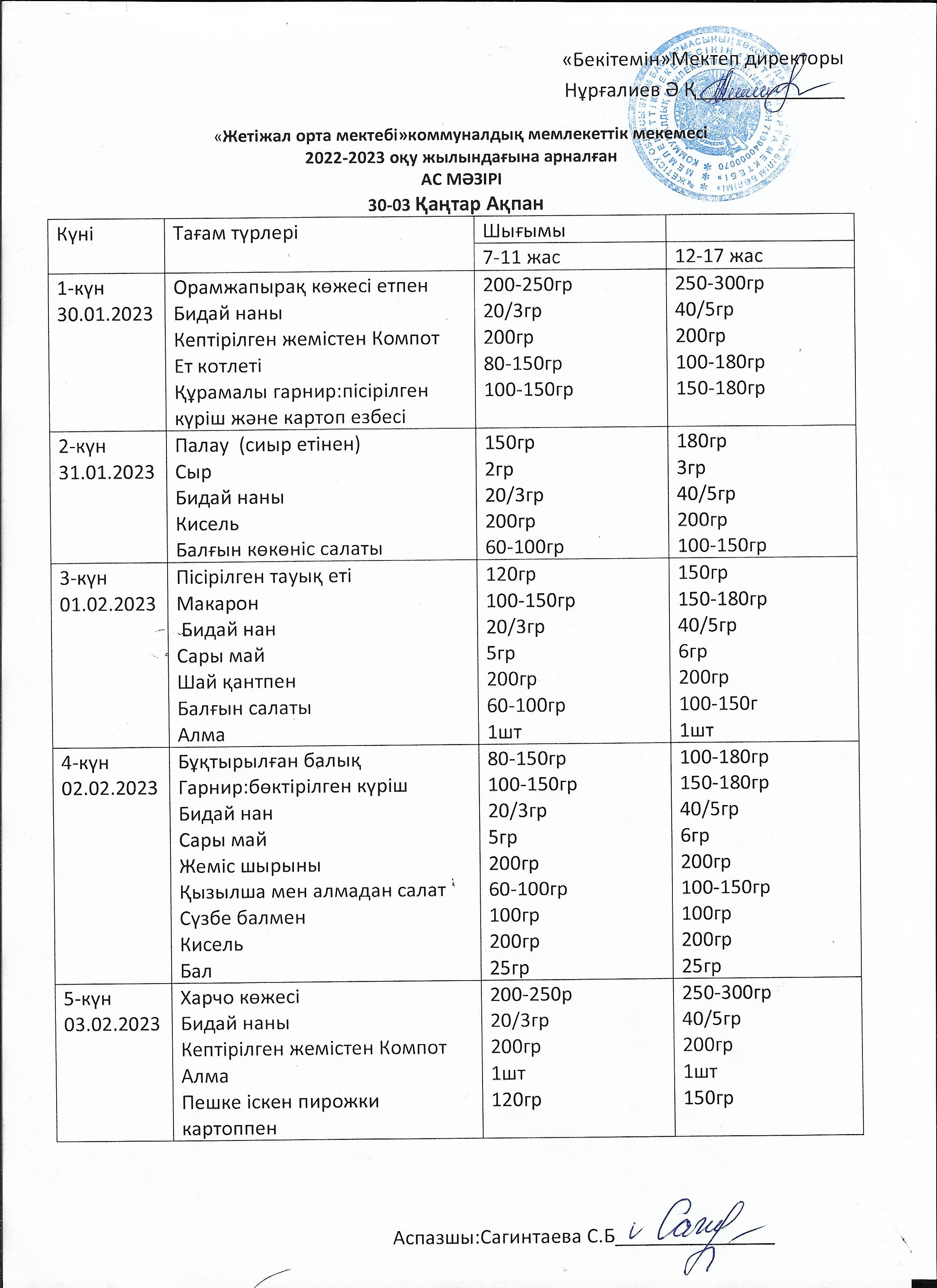 30 қаңтар - 03 ақпан аралығы ас мәзірі » Көксу ауданы Жетіжал орта мектебі