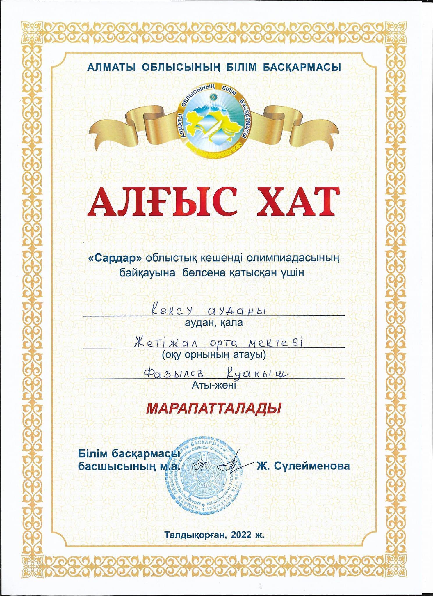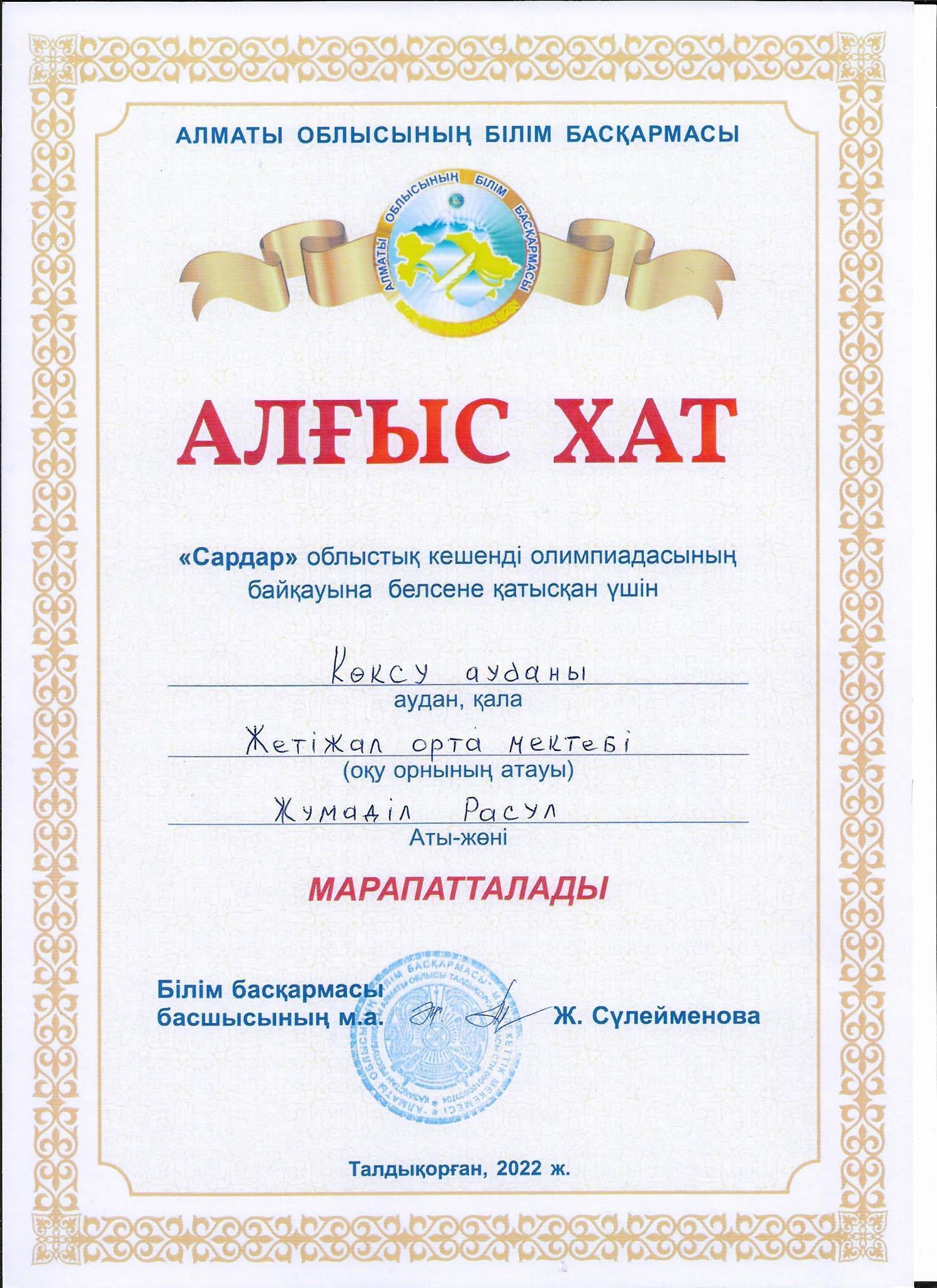 Облыстық "Сардар" кешенді олимпиадасы » Көксу ауданы Жетіжал орта мектебі