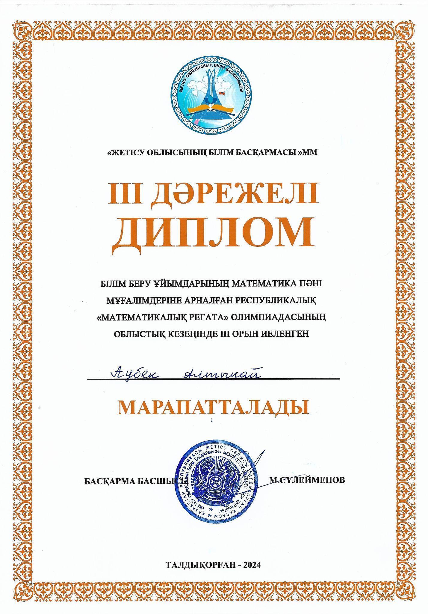 Білім беру ұйымдарының математика пәні мұғалімдеріне арналған республикалық "МАТЕМАТИКАЛЫҚ РЕГАТА" олимпиадасының облыстық кезеңінде ІІІ орын алғаны үшін Жетіжал орта мектебінің математика пәні мұғалімі Аубек Алтынай дәрежелі дипломмен және алғыс хатпен марапатталды.