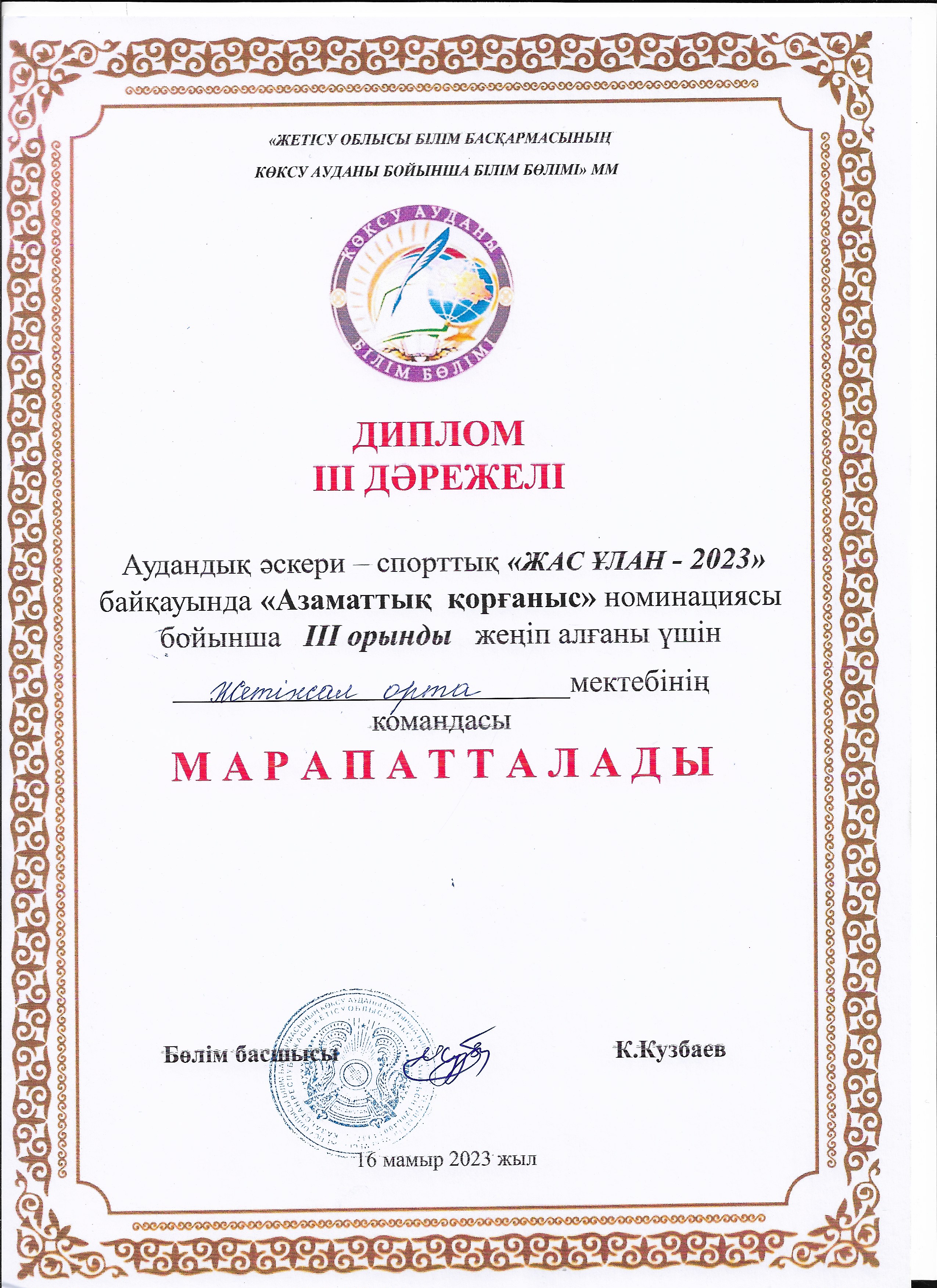 Аудандық әскери - спорттық "ЖАС ҰЛАН - 2023" байқауына Жетіжал орта мектебінің командасы қатысып,  "Азаматтық қорғаныс" номинациясы бойынша ІІІ орынға ие болып, "Саптық жаттығуларды орындау" номинациясы бойынша  ІІ орынды  жеңіп алды. Шын жүректен құттықтаймыз!!!