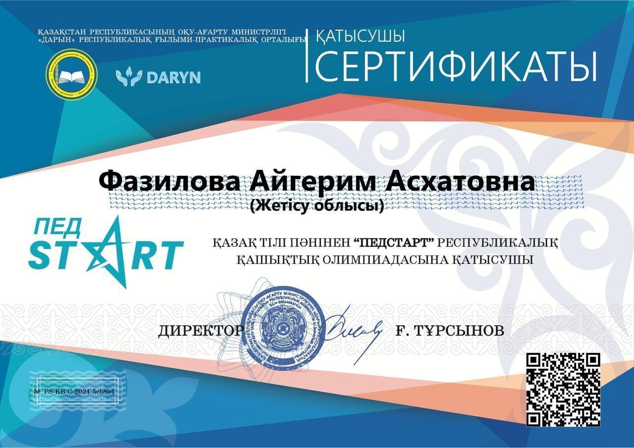 Қазақ тілі пәнінен бастауыш сынып мұғалімдеріне арналған "ПЕДСТАРТ" республикалық қашықтықтан ұйымдастырылған олимпиадаға бастауыш сынып мұғалімі:Фазилова Айгерим Асхатовна қатысып, жүлделі ІІ орынға ие болды.Шын жүректен құттықтаймыз!!!@koksu_bilim @zhetysu_bilim @jetisy_daryny @marat.suleimenov81 @rspc_daryn @uchitelya.kz