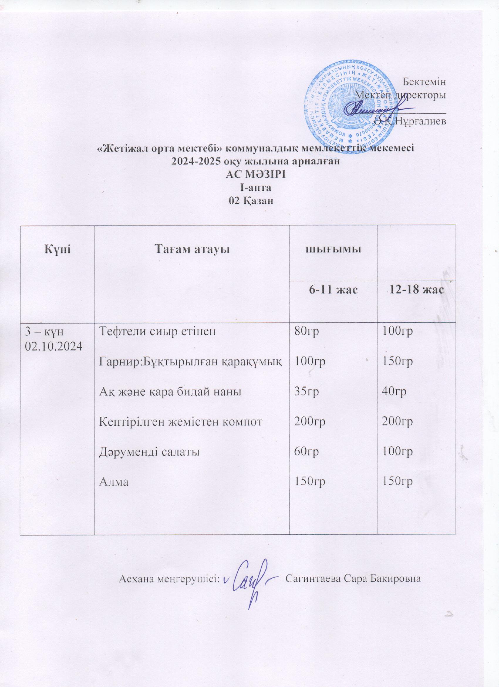 Ас мәзірі 02.10.2024ж » Көксу ауданы Жетіжал орта мектебі