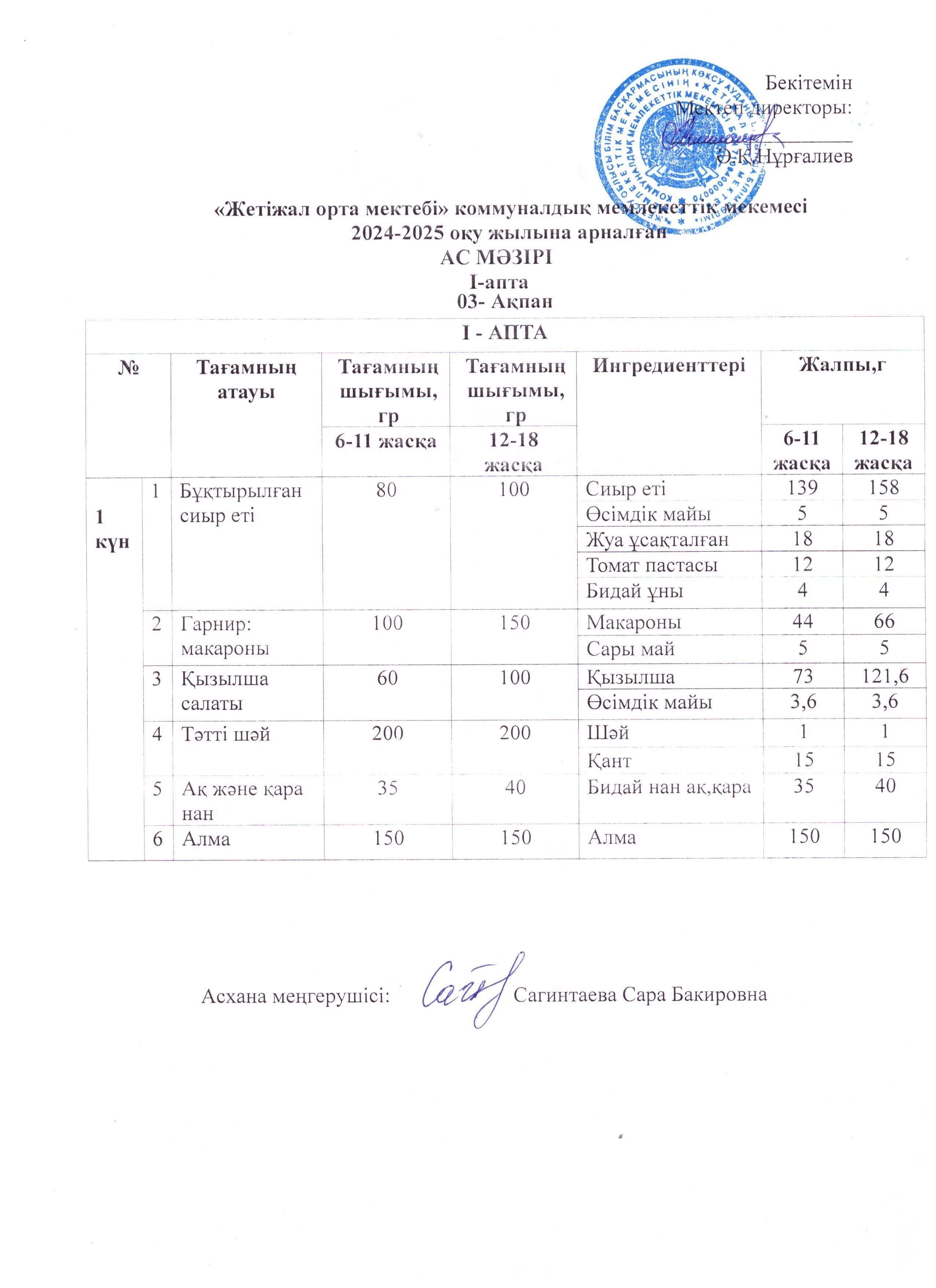Ас мәзірі 03.02.2025ж » Көксу ауданы Жетіжал орта мектебі